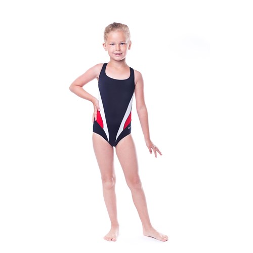 Kostium który prezentujemy, dzięki swojej oryginalnej stylistyce oraz doskonałemu krojowi bez wątpienia sprosta oczekiwaniom każdej dziewczynki. Kontrastujące wstawki, znajdujące się po bokach, urozmaicają krój.